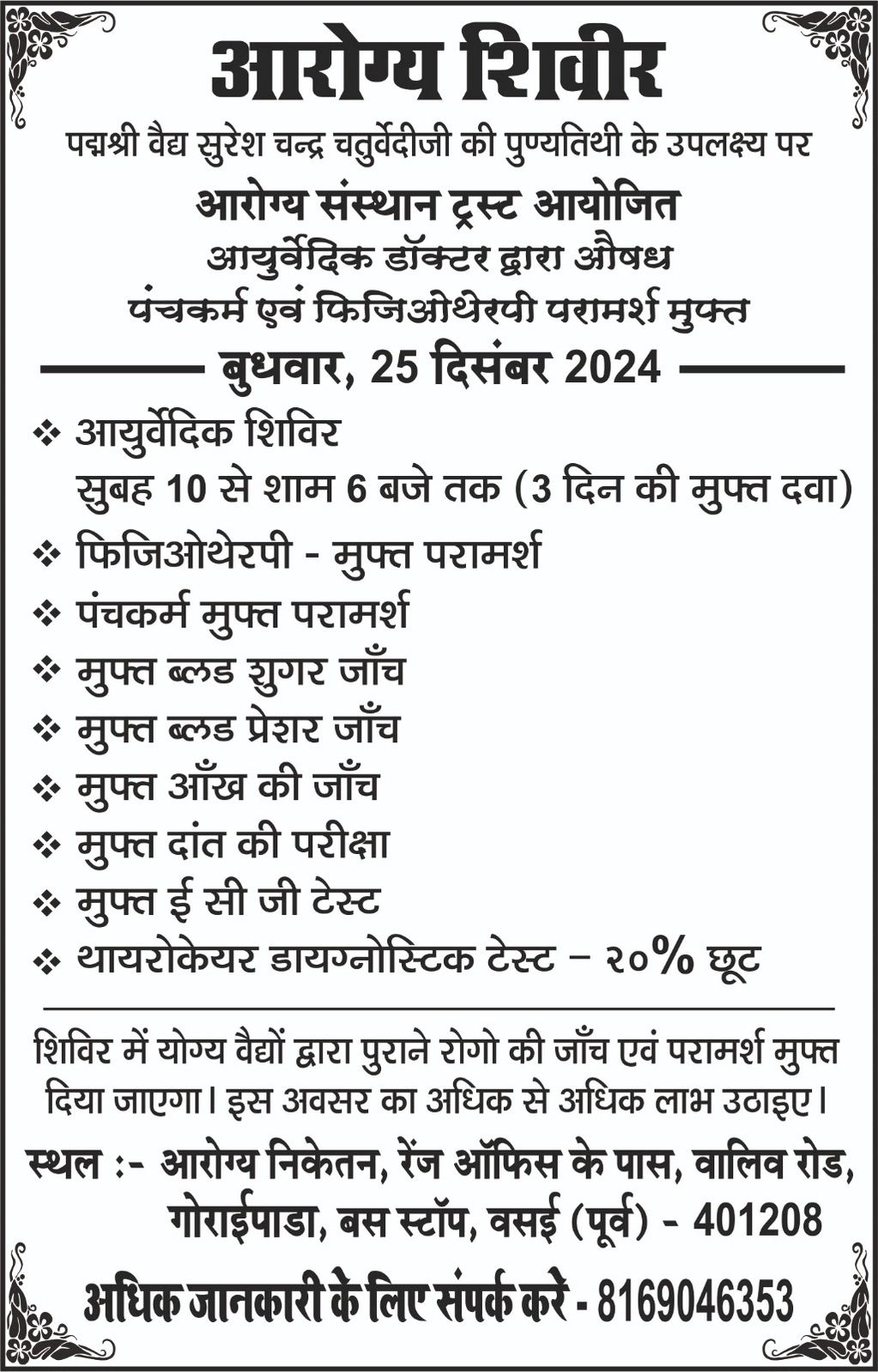 Free Medical camp on 25th December 2024 to commemorate death anniversary of Dr. Suresh Chaturvedi